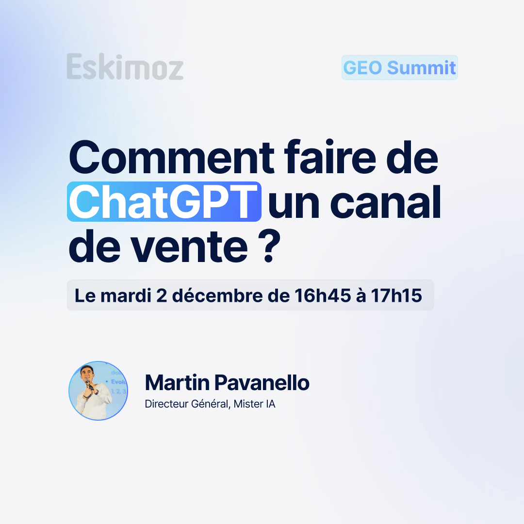 LâIA transforme profondĂ©ment la maniĂšre dont les entreprises gĂ©nĂšrent du trafic, gĂšrent leurs prospects et dĂ©veloppent leurs ventes. Câest dans ce contexte que Mister IA sâassocie Ă Eskimoz pour le GEO Summit, lâĂ©vĂšnement de rĂ©fĂ©rence sur le Search IA et les nouveaux usages de lâintelligence artificielle dans le marketing digital.